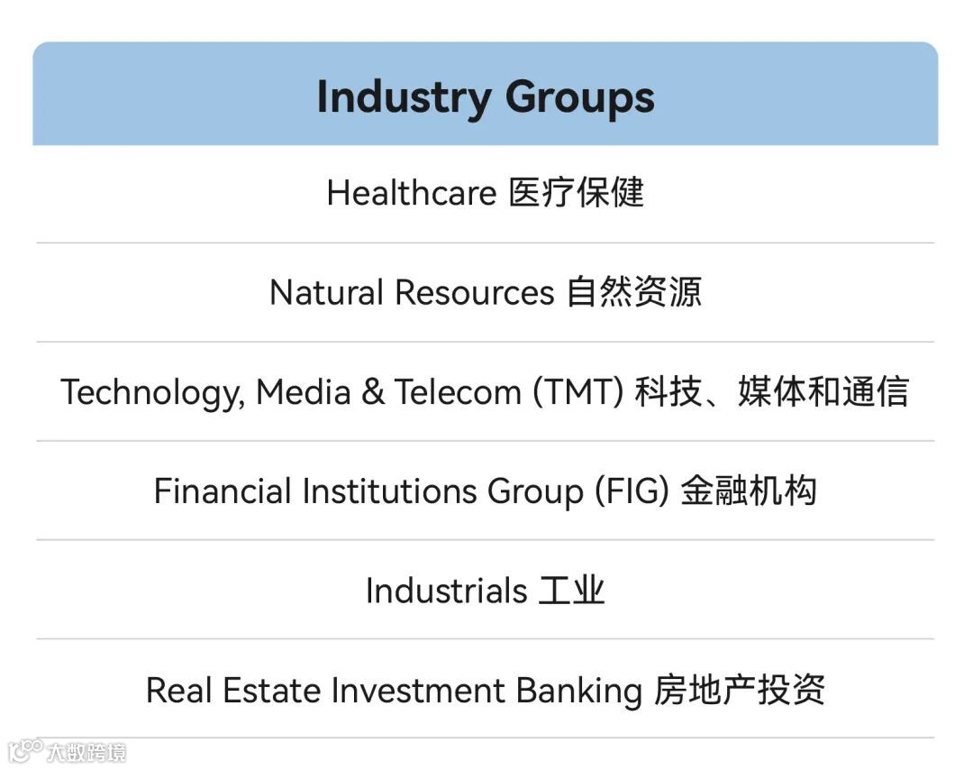 Industry Groups的工作覆盖某个特定的行业,但是涉及到许多不同类型的交易。