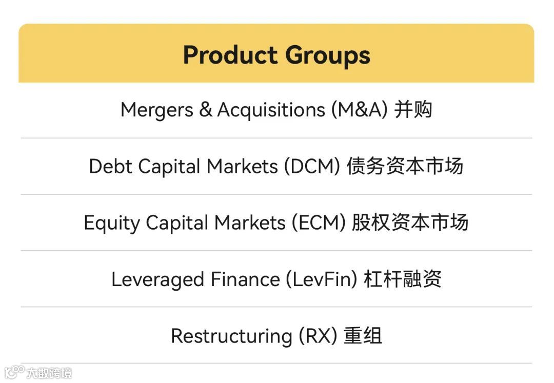 产品组Product groups负责处理不同行业、但特定类型的deal,按照交易类型分组,如并购、债务发行等等↓