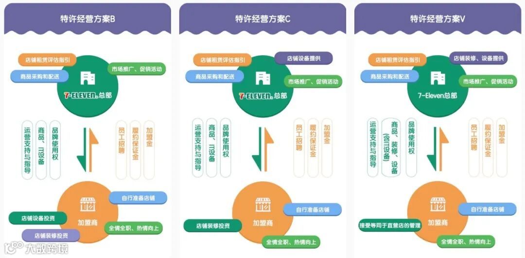 下游加盟商可依自身实际情况,选择“店铺”、“装修”、“设备”是否由7-Eleven总部提供,不同排列组合,对应不同加盟策略。