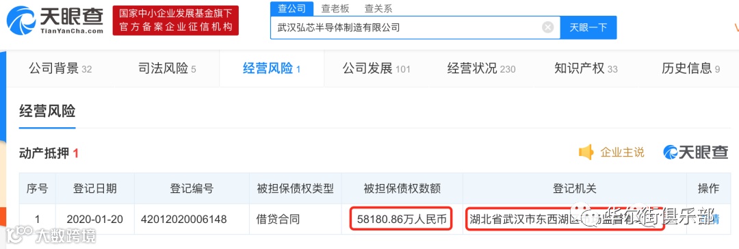 据天眼查显示,今年1月,武汉弘芯向湖北省武汉市西湖区市场监督管理局登记了一项动产抵押,数额不小,有5.8亿之多。