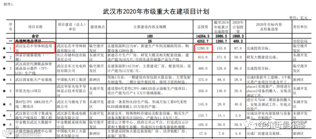 在《武汉市2020年市级重大在建项目计划》中,武汉弘芯半导体制造项目也位列第一,总投资额显示为1280亿元。