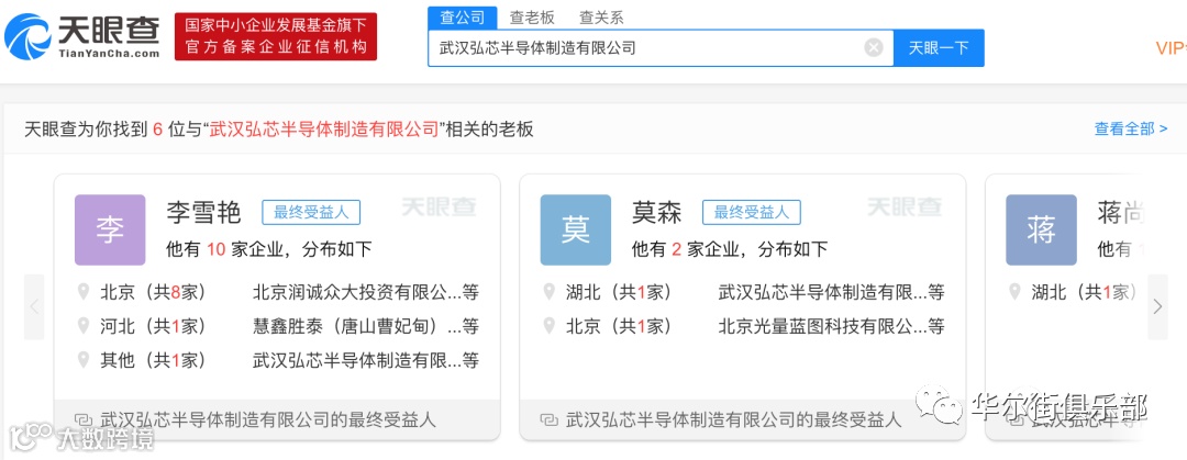 天眼查提供的工商资料信息显示,武汉弘芯股东为2名自然人——李雪艳、莫森。