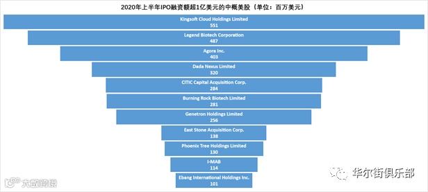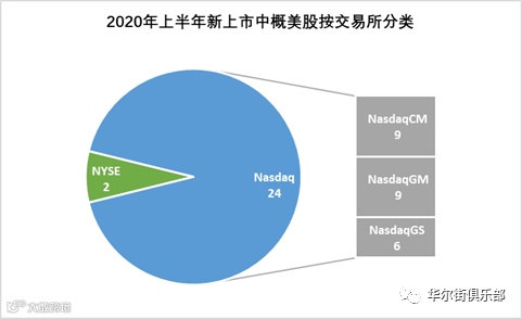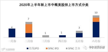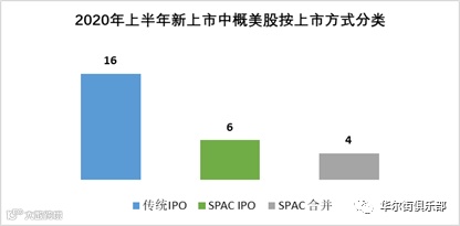 2020年上半年共计有26家中概股登陆美国资本市场,数量超过去年同期的23家。其中16家通过传统IPO,6家通过SPAC(特殊目的公司并购)IPO,4家通过SPAC合并完成上市。和去年同期一样没有中概股通过转板(up-listing)在主板上市成功。