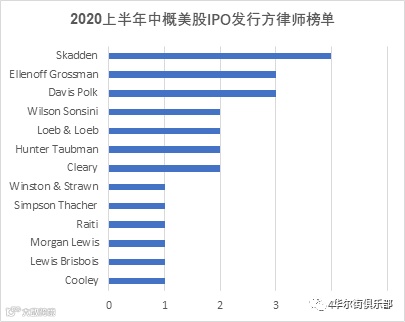 Skadden,Arps, Slate, Meagher & Flom (“Skadden”) 今年上半年服务了16家IPO中的4家公司,即25%市场份额。其后的发行方律所是Davis Polk (3), Cleary (2), Hunter Taubman (2)。下图是具体数据分布: