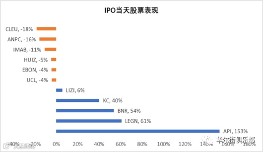 这里我们只对16家传统IPO公司在挂牌当天的表现做简单的分析。16家传统IPO只有5家公司交易首日的收盘高于发行价,其中上周五刚刚上市的声网首日涨153%领跑,紧随其后的是传奇生物(61%),燃石医学(54%),金山云(40%),和荔枝(NASDAQ: LIZI; 6%) 。另外有5家公司挂牌首日收盘价与发行价基本持平,而另外6家公司挂牌首日收盘跌破发行价。