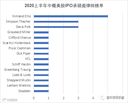 上半年比较活跃的承销商律所是Kirkland & Ellis (5),Davis & Polk (2),Simpson Thatcher (2), 总共占据了16家IPO的56.3%。其余7家律所各做了一个IPO承销商律师。下图是具体数据分布: