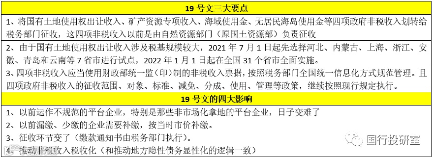 3、2018年2月28日和2018年7月20日分别发布的《关于深化党和国家机构改革的决定》和《国税地税征管体制改革方案》明确“将省级和省级以下国税地税机构合并,并要求合理确定非税收入征管职责划转至税务部门的范围,对依法保留、适宜划转的非税收入项目成熟一批划转一批”。而与之相对应,2021年6月4日四部门联合发布的19号文(参见土地出让收入划转税务部门征收,如何正确理解?)便是具体实践。
