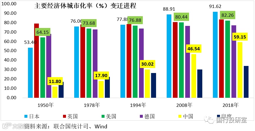 显然四十余年的历史进程中,3.50亿乡村人口离开乡村参与了中国的城市化与工业化进程,并伴随着土地金融制度的崛起。但是与发达经济体相比,这一过程并未结束,我国的城镇化率仍有不少差距,未来仍有较大提升空间。