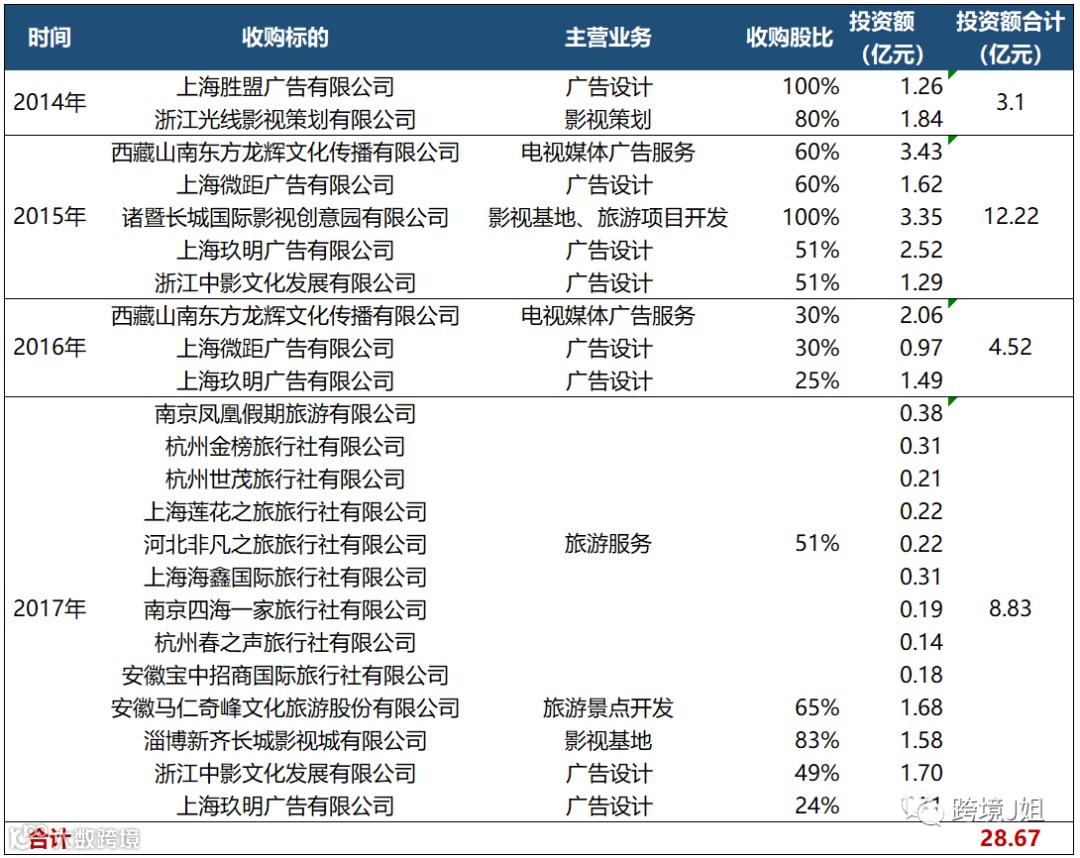 从J姐统计的下面这张表格可以看出,2014至2017年间,长城影视较大规模收购合计达28.67亿人民币,涉及18家公司,多涉及影视基地、旅游服务及广告设计领域。