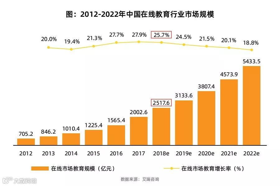 在线教育的规模正在逐渐增加,根据艾瑞咨询《2018中国在线教育行业发展研究报告》,2018年中国在线教育市场规模达2517.6亿元,同比增长25.7%,预计未来3到5年市场规模增速保持在16至24%之间。