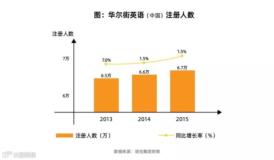 根据华尔街英语前母公司培生集团的财报显示,2013年华尔街英语(中国)的注册人数是6.5万,同比上涨7%;2014年是6.6万,同比上涨1.5%;2015年是6.7万,同比上涨1.5%。增速是在不断放缓的。