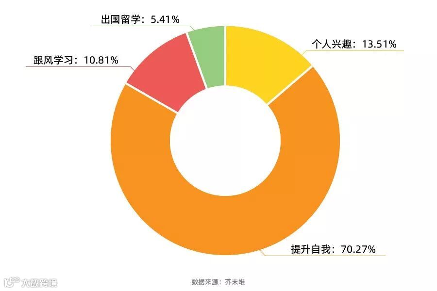 有调研显示 ,能够坚持学习一年以上的人只有14.29%,大多数人只能坚持1-3个月,占比高达40%。还有一项调研显示,70.27%的人学英语是为了自我提升,真正刚需的出国留学只占到5.41%。
