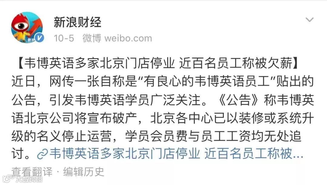 2019年10月,韦博英语倒闭,行业震惊。小培训机构倒闭常见,但有21年历史的老牌机构都倒了,就有些反常。