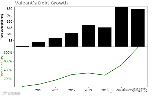 此外,Pearson大幅举债用于支付收购费用。从数据上来看,Valeant公司债务总额从2010年的35亿美元飙升至2015年的310亿美元。债转股比例从14%(可以理解为1美元股东权益中,有0.14美元是借来的)上升到900%以上(股东权利可能被透支了9倍)。