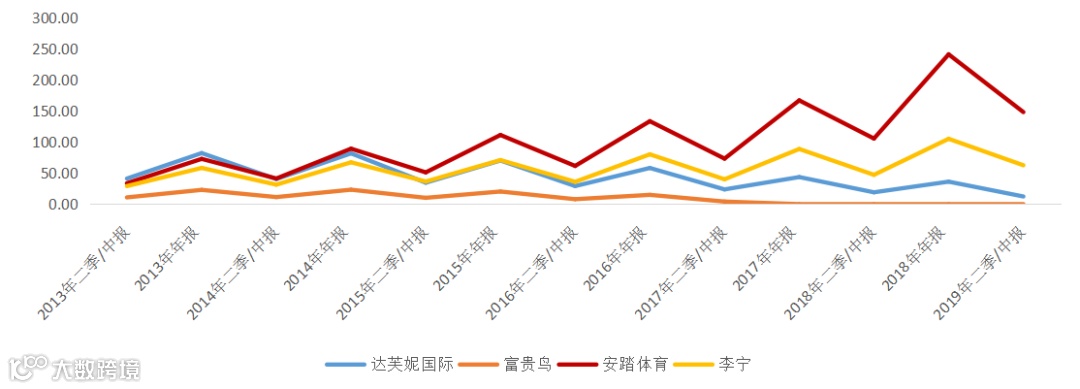 两家休闲鞋(富贵鸟、达芙妮)以及两家运动鞋品牌(安踏、李宁)营业收入