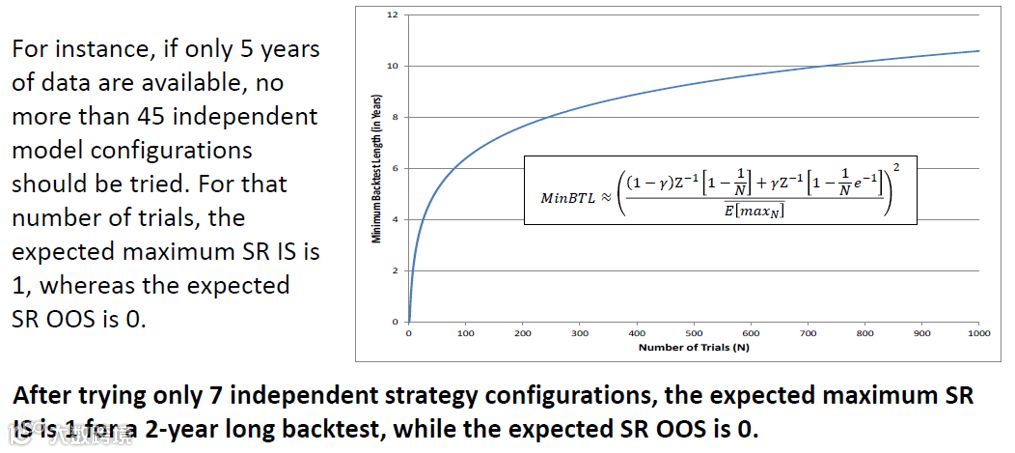 下图结果来自 Bailey and Lopez de Prado (2012) 的研究。假设数据无法预测收益率,该研究发现,如果数据的长度仅有 2 年,则仅需要通过 7 个检验就能找到夏普率为 1 的策略;而如果数据的长度提高到 5 年,达到同样的效果则需要 45 个检验 —— 其实也非常很容易。