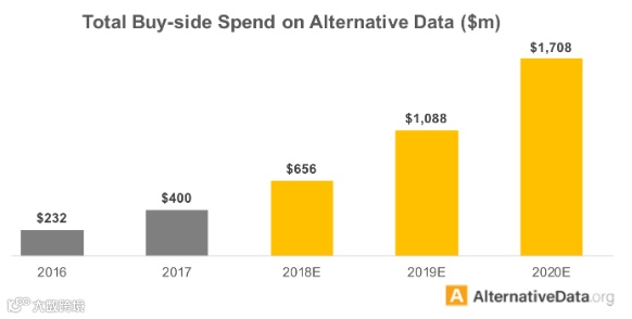 读到这里有小伙伴也许会问“你这题目文章叫前景和陷阱,这前面 blabla 说了五点都是陷阱啊,前景在哪里?”其实,把坑都填上、科学的使用再加之正确的预期,那么这些“陷阱”就将变成“前景”。据来自 AlternativeData.org 的统计数据显示,海外买方在购买另类数据上的支出在最近几年逐年增长。