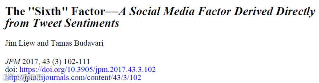 Liew, J. and T. Budavari (2017). The “six” factor – A social media factor derived directly from tweet sentiments. The Journal of Portfolio Management, Vol. 43(3), 102 – 111.