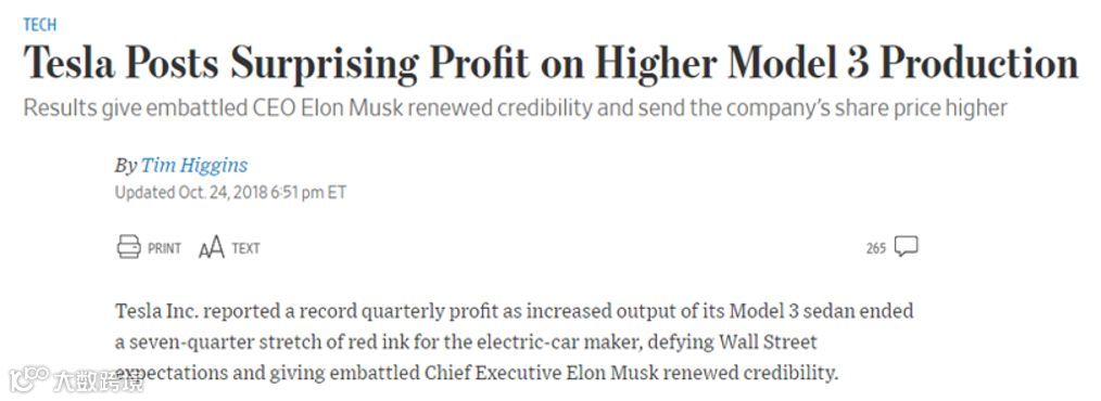 美国时间 2018 年 10 月 25 日,困境中的特斯拉(Tesla)股票录得 9.14% 的大涨,只因为在前一个交易日盘后发布的 2018 Q3 财报大超华尔街预期。财报显示,爆款 Model 3 的产量在过去一个季度较之前几乎翻番,这无疑给了投资人注入了一剂强心针,也引得市场一片狂欢。