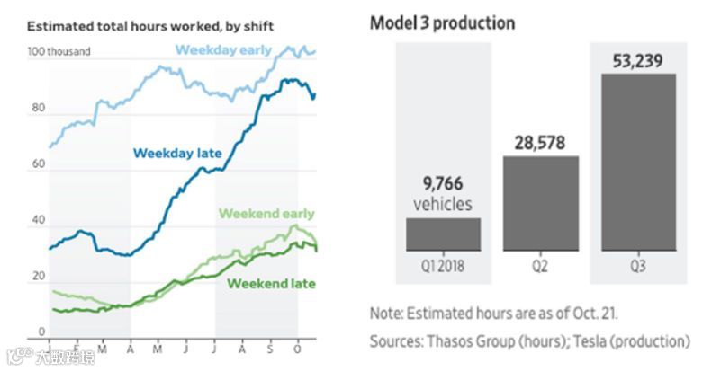 上图中左侧,横坐标 J、F、M 等为月份的英文首字母缩写。深蓝色曲线为通过手机信号估计出来的夜班(weekday late)工作时间。从图中清晰可见,在 6 月到 10 月之间,夜班工作时间较 Q2 有了大幅增长,意味着产能的提高。Thasos 将这个数据分享给了它的一些对冲基金客户。毫无疑问,这一数据发挥了巨大的作用。