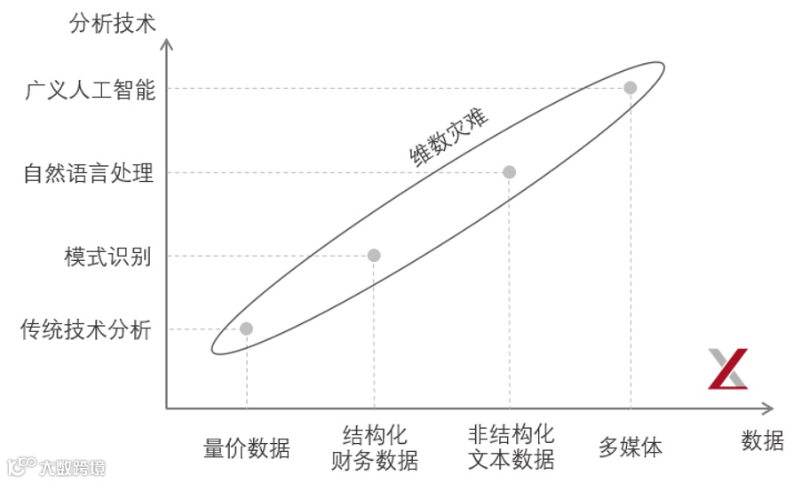 关于另类数据的第一个思考是新的数据类型需要相应的分析技术。当我们仅有量、价数据的时候,传统的技术分析,如均线、布林带就能发挥很大的作用。然而,这些技术分析对结构化的会计报表数据却难有作为。为此,相应的分析手段也应运而生,比如多因子模型等。而如今,如果想要分析非结构化文本数据以及更 general 的多媒体数据,则更是需要相应的技术,如自然语言处理和广义人工智能。显然,这对管理人和投资者都提出了越来越高的要求。