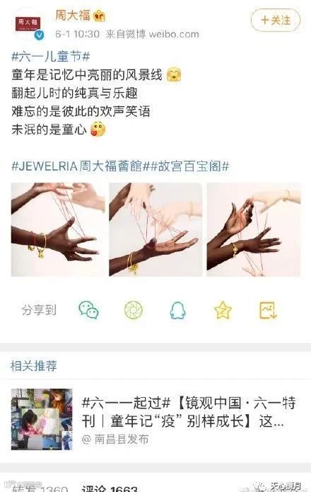 周大福居然也是媚黑族,儿童节你放一双黑手恶心人,这种媚黑品牌,坚决抵制。