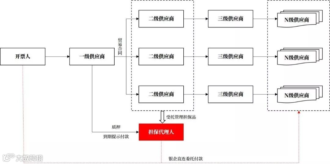 具体而言, 在核心企业向一级供应商开具票据后, 一级供应商即将票据质押予指定的担保代理人。该担保代理人代表二级供应商享有对票据的质押权利, 票据项下资金结算应优先用于清偿对二级供应商之债务。对于二级供应商而言 ,其对一级供应商的应收账款(票据质押担保)可在供应链金融平台向二级以上供应商流转。在票据到期后, 担保代理人依据《票据法》行使票据背书质押权利, 提示承兑人付款。同时, 为避免资金二清风险, 建议通过银企直连委托付款方式, 由开票人在担保代理人的指示下向指定的收款人(也即届时最终持有应收账款的债权人)账户付款。