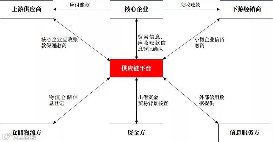 聚焦到金融层面(即资金方视角)来看, 就目前的市场情况而言, 按照供应链金融平台的主导参与方的属性不同可分为以核心企业/金融科技公司为主导及以商业银行为主导的供应链金融平台, 二者均通过将传统贸易关系抽象化为应收账款电子化凭证的开具、流转、融资、清付等环节, 实现核心企业的信用下沉与传递, 主要区别在于是否将商业银行信用引入。