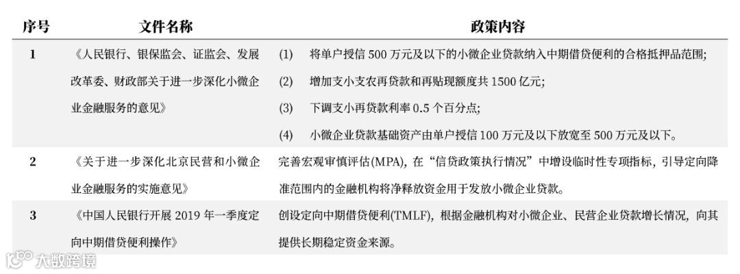 在当前小微企业融资困难的背景下, 中国人民银行与中国银行保险监督管理委员会也陆续出台多项政策引导信贷资金向小微企业投放, 具体包括: