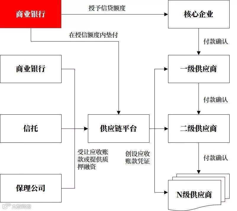 商业银行对核心企业授信, 在授信额度内对供应商转让或质押的应收账款提供垫付。