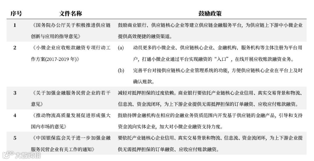 供应链金融是基于真实的贸易背景开展的融资活动, 对外可表现为应收账款质押或转让融资、预付款融资、仓储融资等, 实质仍是将核心企业的信用向供应链各层级供应商灌溉, 帮助各供应商加速应收账款周转、持续获得资金。近年来, 我国已陆续出台多项政策鼓励开展围绕核心企业信用的应收账款融资:
