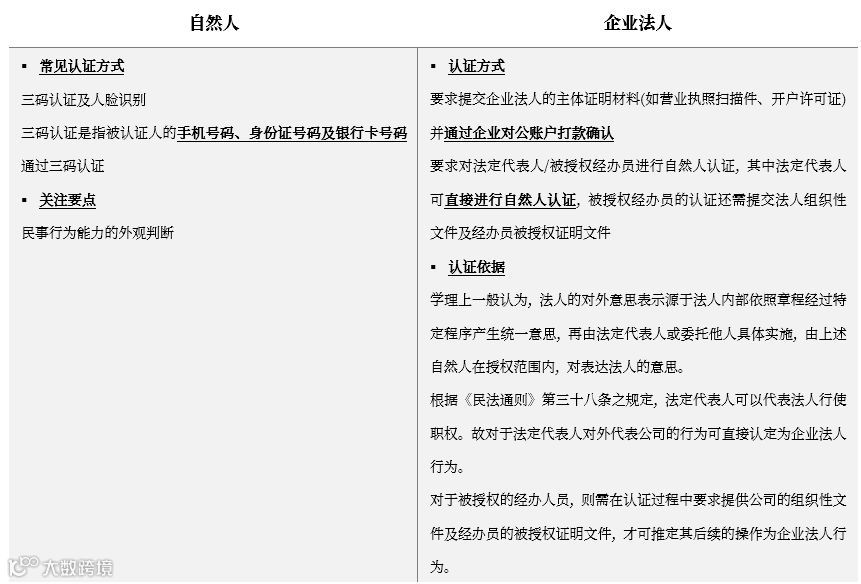 在互联网领域, 确认用户身份主要是通过实名认证方式实现。一般而言, 在平台正式开展相关业务前, 需要对拟注册登录的用户进行实名认证, 确认其具有完全民事行为能力并已获得有效完整的授权, 以保证其在平台进行签署电子合同等操作时具有主体唯一性和适格性。需经认证的用户包含了自然人及企业法人, 请见下表中我们对于二者认证方式的异同比较。