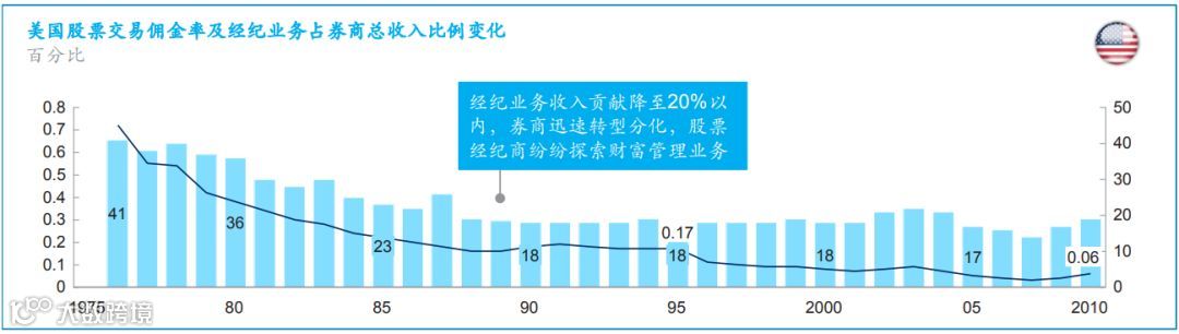 据麦肯锡分析,近三十年,美国券商基本上完成了从单一经纪业务券商向财富管理型机构的转型,经纪业务收入贡献降至20%以内。