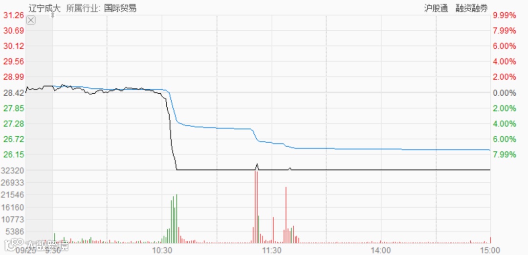 今天(9月25日)上午10点30分之后,辽宁成大股价毫无预兆的直线跳水,短短几分钟就砸到跌停板。