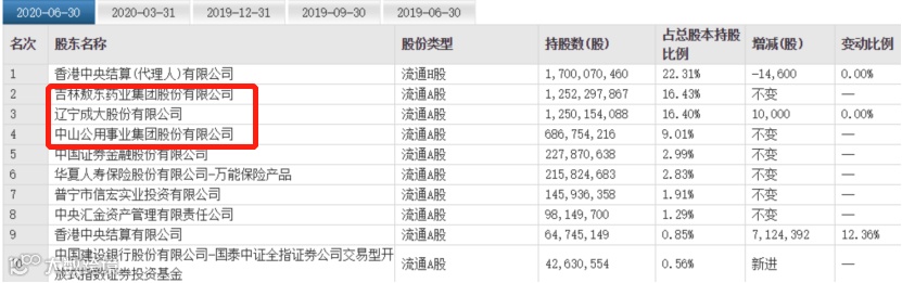 在目前广发证券的前十大股东中,吉林敖东、辽宁成大、中山公用分别以16.43%、16.40%、9.01%的持股比例,排在第2、3、4位。