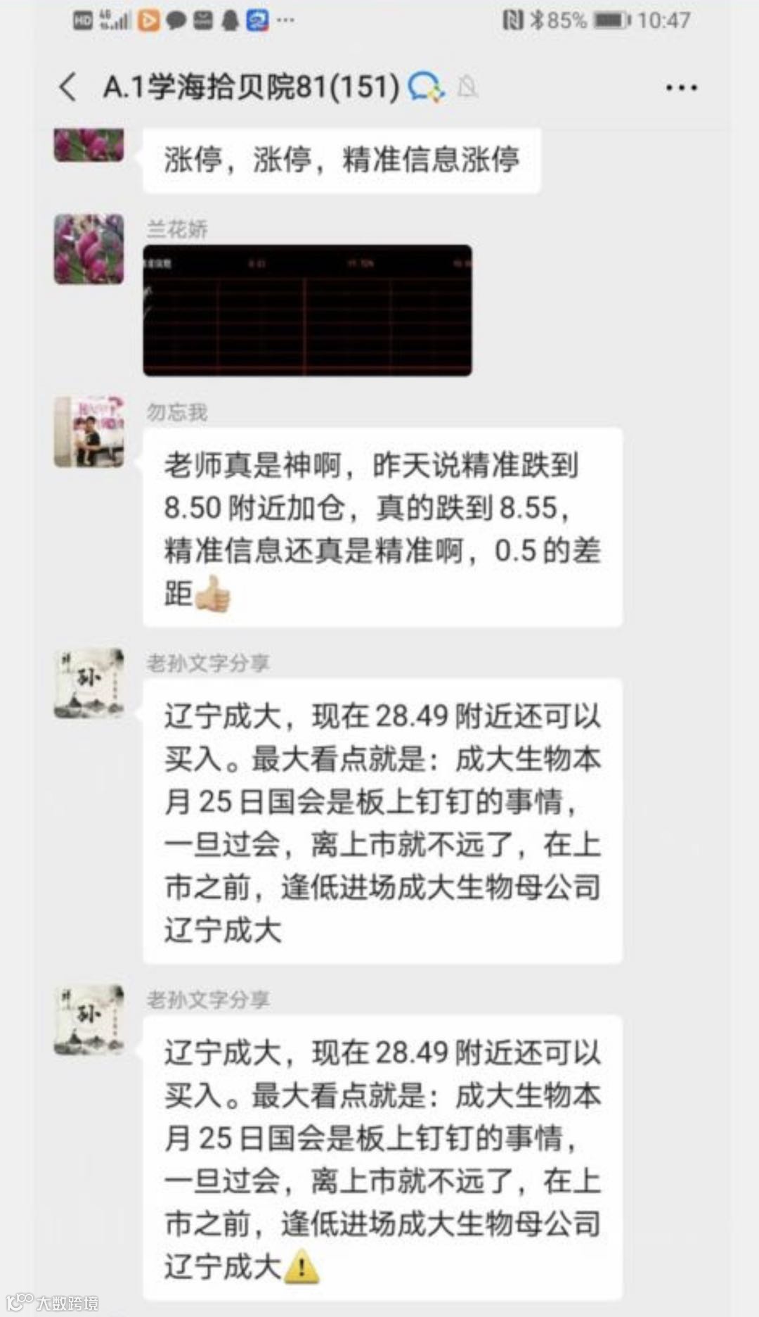 在某个微信群里,有所谓的指导老师全力号召28.45元买入辽宁成大,而且还是反复号召。