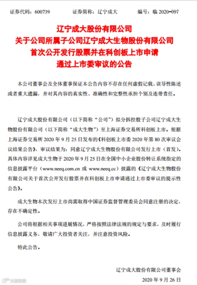 不过辽宁成大披露的成大生物过会的公告,落款却是9月26日,提前了一天。