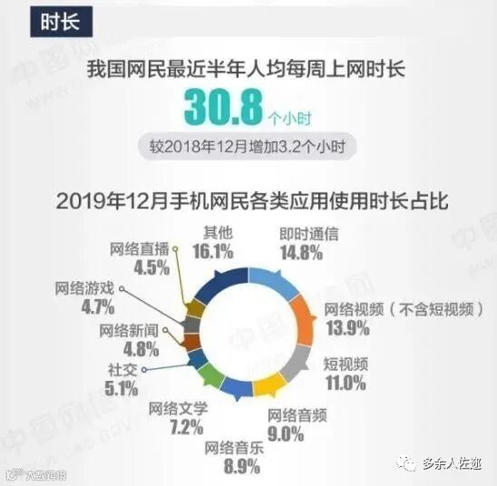 要知道在2009年时,网民每周人均上网时长是18.7小时;十年后,2019年,网民每周人均上网时长是30.8小时。这被平均的30.8小时,在我们这些低头族中应该是一个很清楚的事情,我一天上网时间几乎是12个小时!而且我几乎不看短视频。