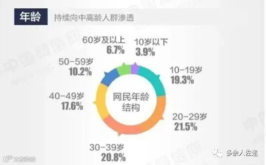 20-29岁、30-39岁网民占比分别为21.5%、20.8%,高于其他年龄群体;40-49岁网民群体占比为17.6%;50岁及以上网民群体占比为16.9%,互联网持续向中高龄人群渗透。拿着退休金又思维顽固的那一代老人们,除了逛菜市场和晒太阳,也有了一个重要的事情,就是刷视频,看八卦,完成趣头条等新闻客户端的任务赚积分一天挣一块多钱!