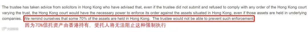 但由于底层信托资产的70%都在香港,香港法院完全可以强制执行底层香港资产来执行。。。