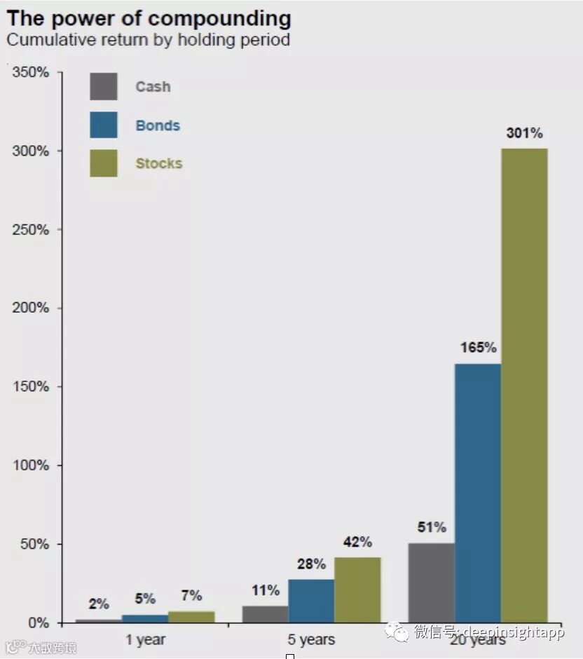 导读:本来准备周末写这篇随笔,正好最近全球股市暴跌,也算应景提前把这个观点分享一下。这几天无论A股,美股还是港股都出现了几年难遇的暴跌,许多人堪比1987年黑色星期一。对于大部分投资者来说,暴跌肯定并不愉悦。那么投资中应该如何躲避暴跌,甚至寻找无风险的收益呢?很遗憾,在绝大多数情况中,风险和收益是匹配的。而且从一个长期的时间维度看,不暴露风险才是最大的风险。我们先看下面这张图,过去20年美国三大类资产的收益率。股市的收益率在20年时间最终达到了301%,远远高于低风险债券的165%,而现金类资产收益率只有51%。