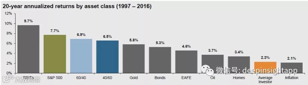 够提前预知,但几乎很难抓住每一次波动率。同时,短期方向性的择时影响因素特别多。比如这一次市场波动主要是美国国债收益率上升,通胀预期抬高造成的。但是这种情况在2009年之后几乎10年的美股牛市中也出现过多次。每一次想要抓住波段的投资者,最终收益率未必比长期持有优秀企业的投资人高。下面这张图可能更加经典,没有算上2017年的大牛市,在1997到2016年的20年之间,标普500的年化收益率已经高达7.7%,完全跑赢了通货膨胀的2.1%。其中还叠加了2000年网络股泡沫奔溃,2001年的911恐怖袭击,以及2008年的全球金融危机。在一个时间的长河中,股票资产还是有很高收益率的。相比之下,那些想着抓住每一次波段的个人投资者年化收益率最终只有2.3%,仅仅小幅跑赢通胀,却跑输了所有其他资产的年化收益率。作为一个群体来说,长期做到择时的正确是不可能的。历史上也没有那一位投资大师依靠不断择时积累自己的财富。