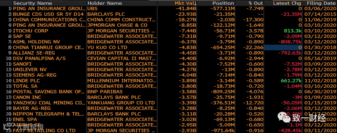 为了便于理解桥水的做空头寸究竟有多大,直接看彭博对全世界做空头寸的排名:前二十中桥水占了9个,其他排名前二十头寸都是UBS大小摩巴克莱等投行(不是自营交易,替客户托管做空头寸的),没有哪个对冲基金像桥水这样大规模做空。