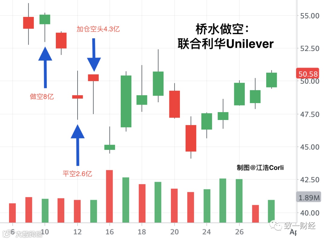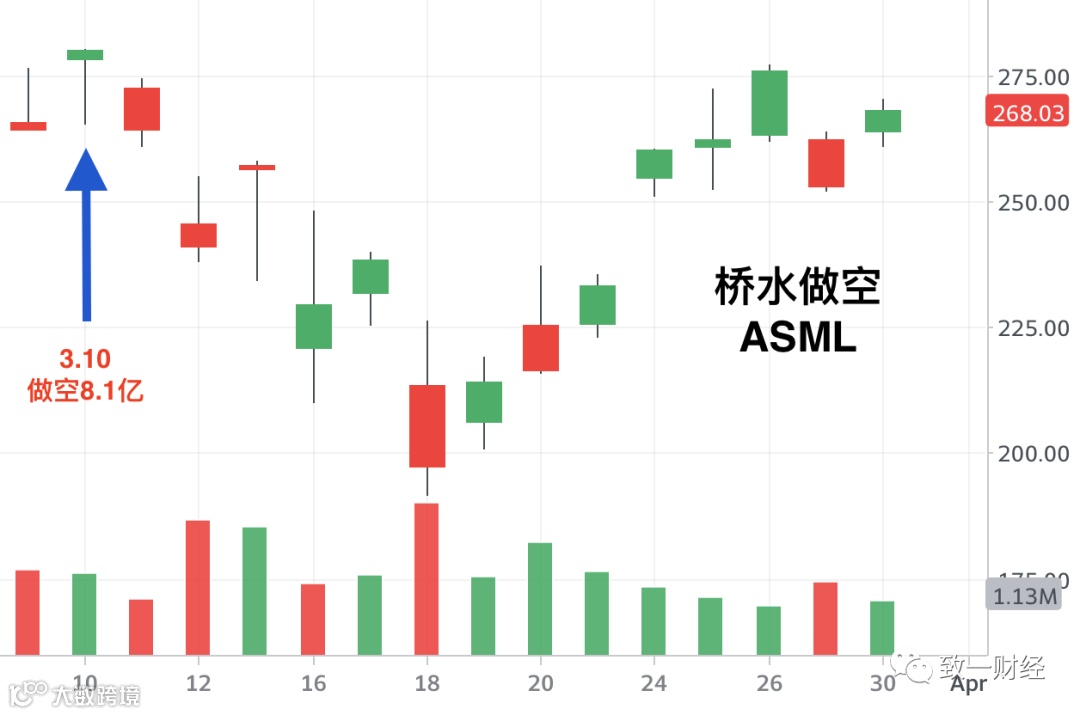 3月10日,专业做空机构分析平台Breakout Point发现桥水公开披露了高达105亿欧元的做空头寸(人民币820亿),其中包括对日化巨头联合利华 8.1亿、软件巨头SAP 7.1亿、医药巨头Sanofi 5.5亿和光刻机垄断商ASML 8.1亿的天量做空。并且这些空头头寸是一次性出现的,不是一直以来就有的对冲头寸(彭博数据也可以验证这一点)。