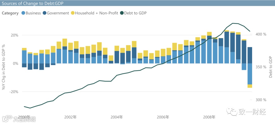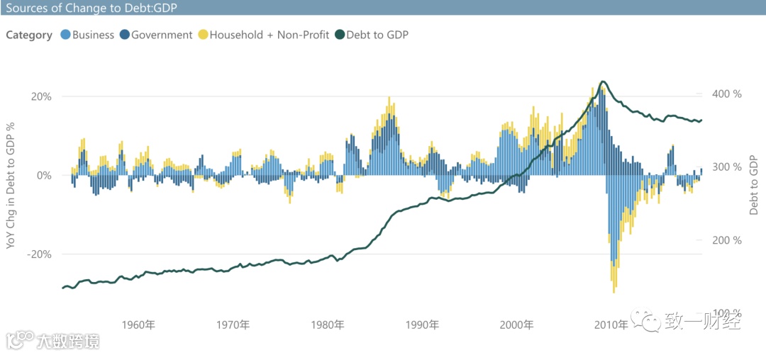 2000年到2010年,美国债务增长中居民部门占了大头(次贷危机的根源)(图中黄色的部分是居民债务对总体债务增长的贡献程度),但是这十年居民部门的贡献度几乎都是负的,反而是政府部门贡献了绝大多数债务增长(政府支出成为美国经济的增长的顶梁柱之一,2013年到2015年政府对GDP贡献度翻了一番)