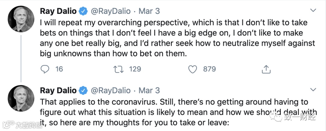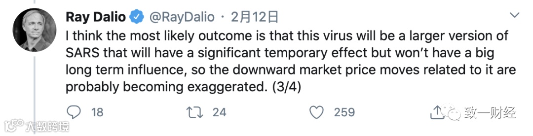2月11日达里奥说市场过于夸大了病毒的影响,“很快可以预见有反弹(I would expect more of a rebound)”。2月12日达里奥补充说“病毒最可能的结果是扩大版的SARS,只是在短期(temporary effect)内有显著的影响,但是长期影响不大,因此市场价格下行可能只是过度反应了(exaggaerated)。”