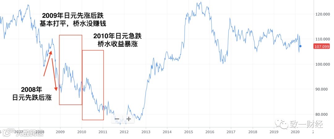 同样的日元也是如此,2008年先跌后涨(图中是USD/JPY也就是美元比日元,USD/JPY的上涨相当于日元相对于美元下跌),到了年末桥水才赚钱。即使是9.4%的收益,2008年桥水也是绝对耀眼的存在之一。