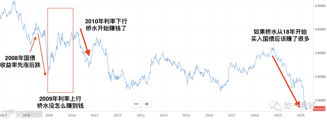 2008年初,桥水就采取了做多国债、做多日元的策略,认为金融危机下美联储必定降低利率、金融市场动荡一定会导致日元升值(避险货币),结果在上半年亏损惨重(4月亏损超过10%)。即使贝尔斯通在3月15日股价暴跌45%、被美联储和JP Morgan接手了,当时市场上“没有几个人把贝尔斯通的情况和宏观经济中的问题联系在一起”[1],市场利率在08年上半年稳步上升。到了下半年(尤其是年末)才断崖式下跌,此时桥水的策略才起效。