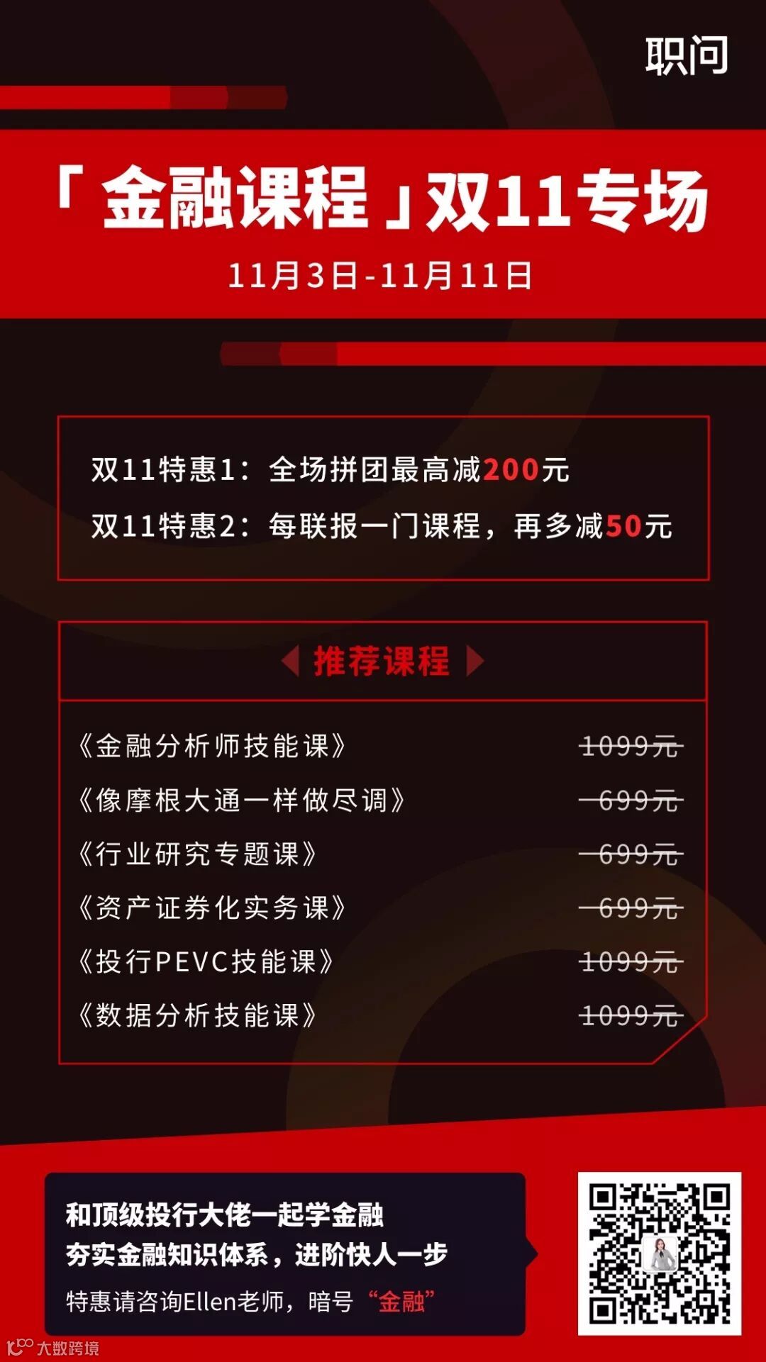 除了免费学习,职问还在双11为大家准备了更多课程优惠,金融分析系列课程已开启特惠,感兴趣的同学请直接咨询Ellen老师~