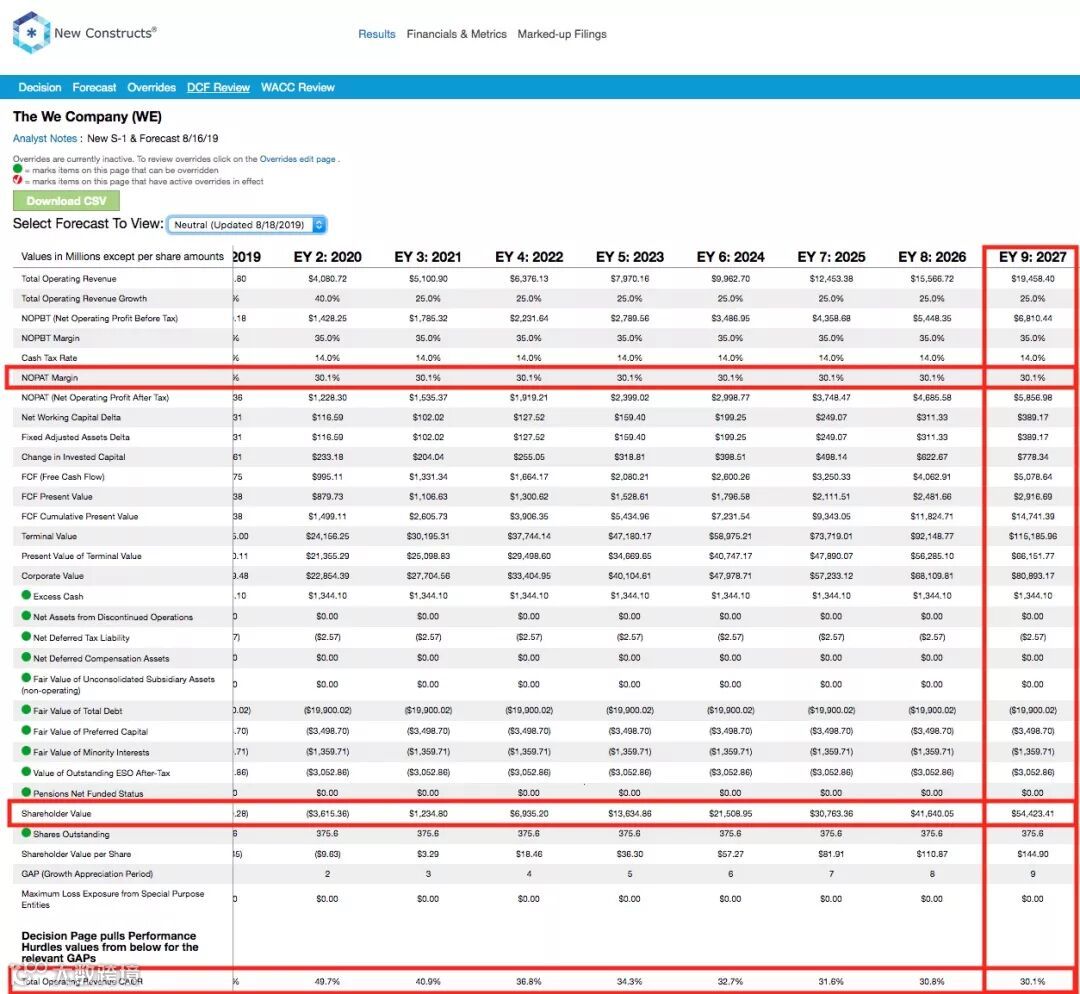 福布斯分析该数据并指出,对标来看,WeWork如果要证明470亿美金的估值(Shareholder Value)没有水分,它的NOPAT Margin(税后净营业利润率)必须达到30%(类似于BXP目前的营业状况),并且在接下来的九年里,年复合增长率(Total Operating Revenue CAGR)达到30%。
